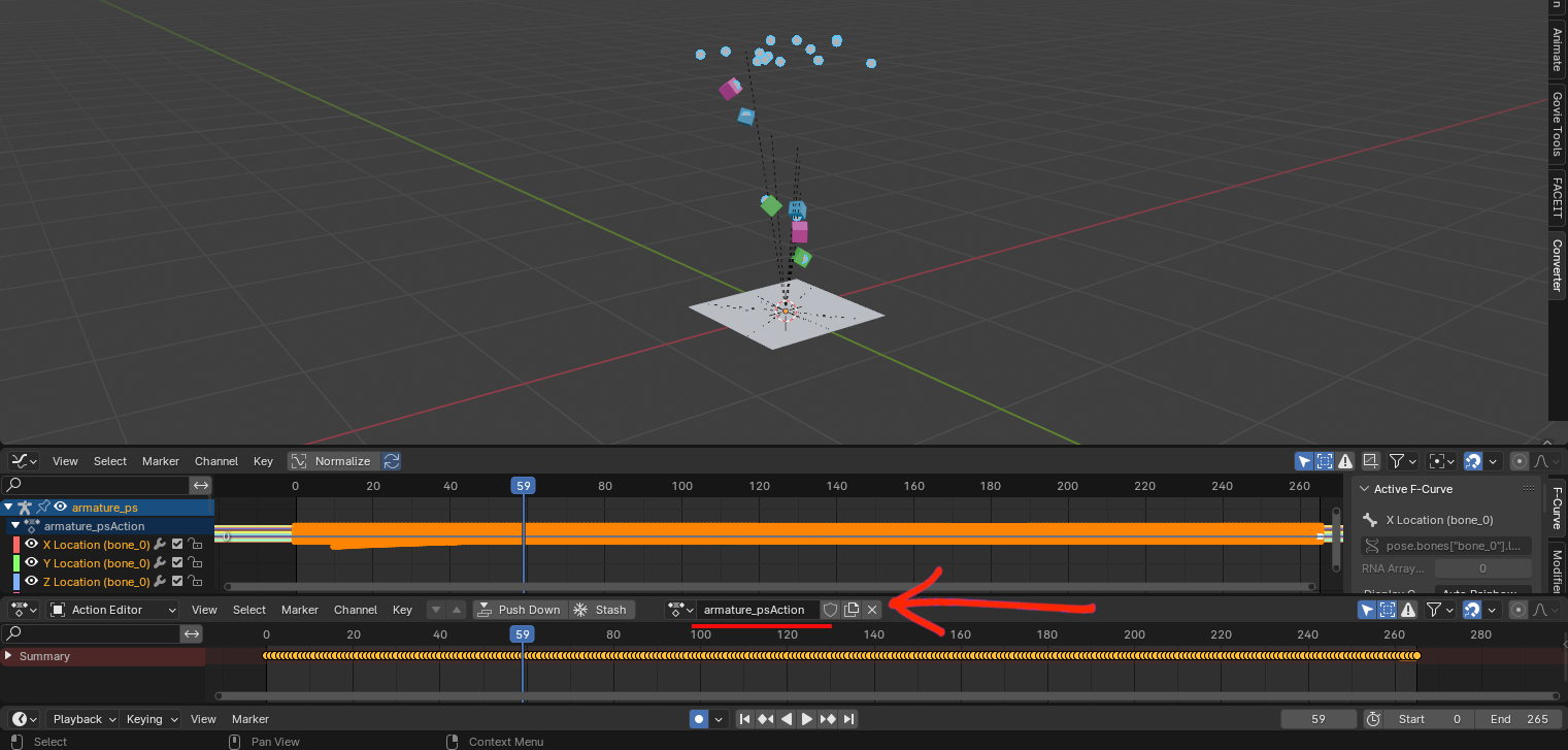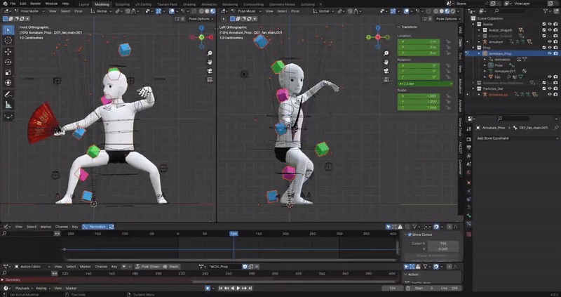 Now that the armature is properly merged and set up, there’s one last step for this to work. If you try to play the animation, you will notice that the particles are not moving. And that is because now they are part of Armature_Prop, and the animation being played by it is the prop one. Remember that particles had their own animation clip? What we need to do now is copy the keyframes from particles animation clip and paste them in the prop animation clip.