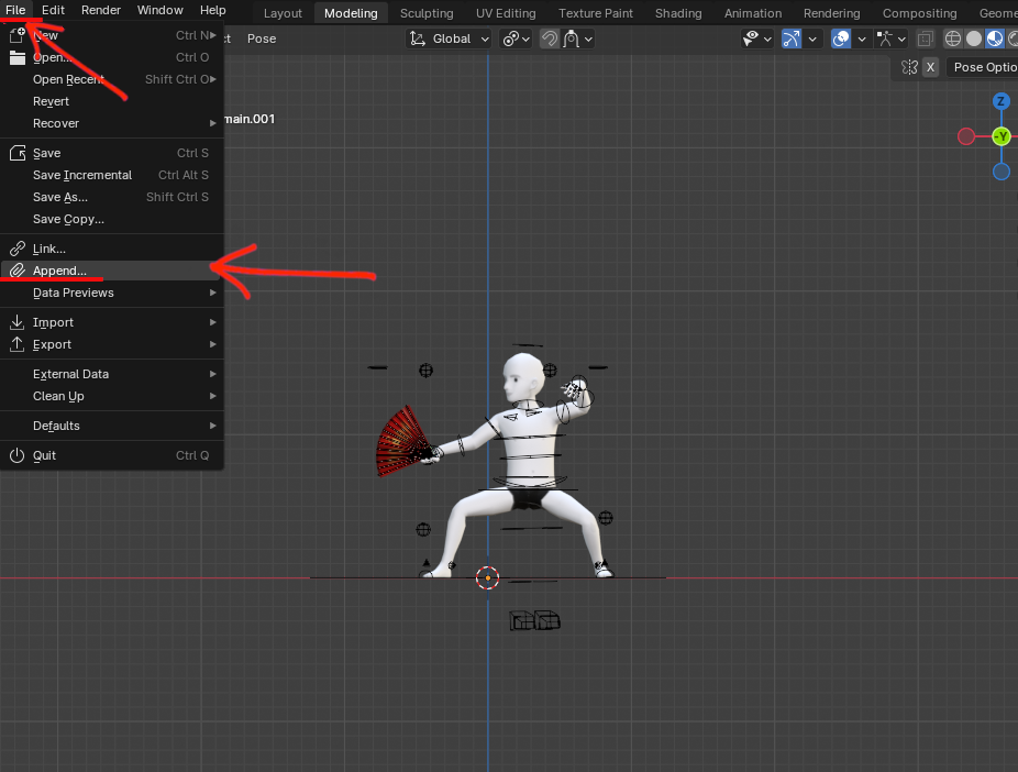 First thing we have to do is import or append the collection generated by the add-on. You could always export the glb file for it and import it into your emote file. Or you could simply append the collection, which is much easier and faster, by going to File > Append, browse the particles file in your computer, select the folder Collection and choose the desired collection.