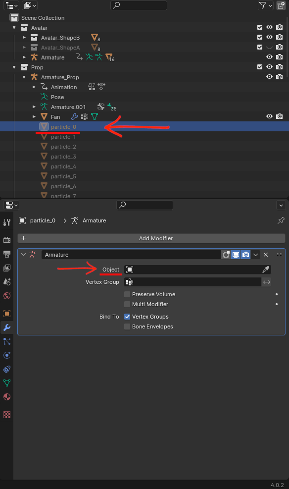 Once you do that, the particles might look messed up, but don’t worry, this is part of the process. To fix that, select each particle object on the Outliner one at a time, go into Object Properties (orange square icon) and under Relations, check if the parent is Armature_Prop. Do this for all particle objects. This means that all objects are child of Armature_Prop.