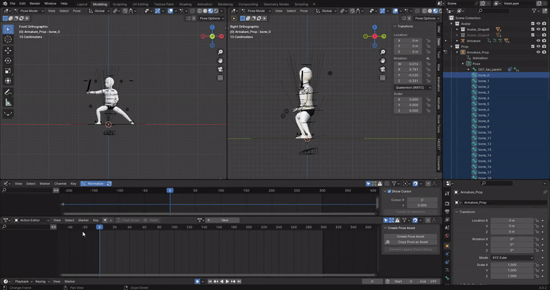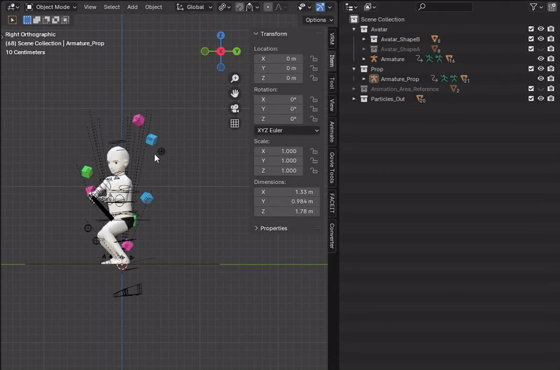 Emotes 2.0 can only have two armatures and two animation clips per file. If we just import the particles, we will end up with three armatures and three animation clips. The way to fix this is merging the particles armature into the prop armature. The reason to merge it to prop and not avatar armature is very simple: the avatar rig can’t be edited in any way by adding or deleting bones. This leaves prop armature as the only option.