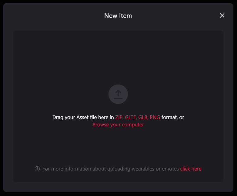 Remember that you need to create a collection before you can upload your file. If you don’t know how to do that, check Creating a Collection . To upload your wearable, just drag and drop the file on the New Item window or browse your computer. It will automatically detect if the file is an emote or wearable. Remember that the collection max file size is 3MB.