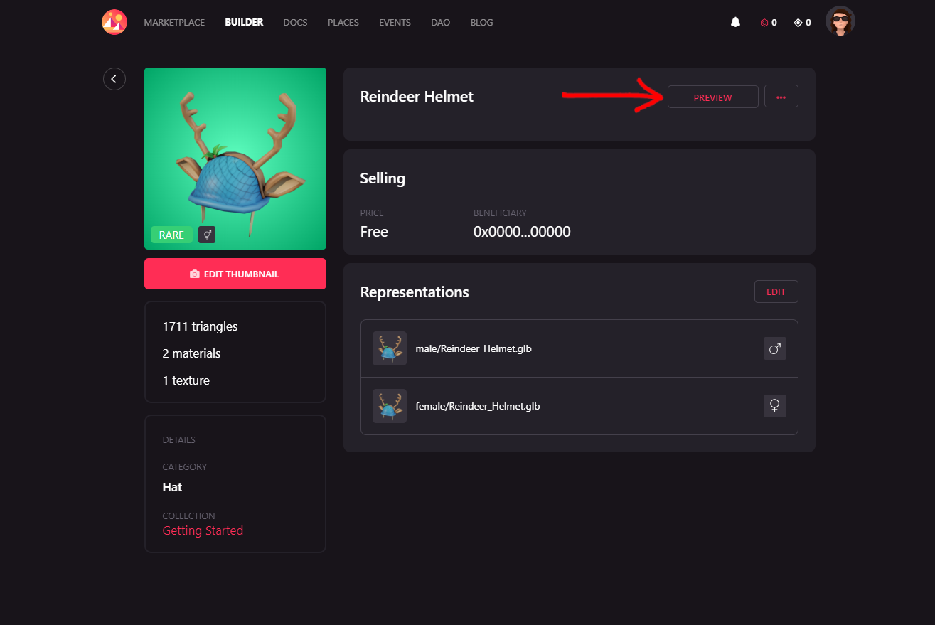Put the item up for sale and you will be back to the list of wearables in your collection. When you click on the item, you will get its general info. Click on the button Preview to see it on the editor.
