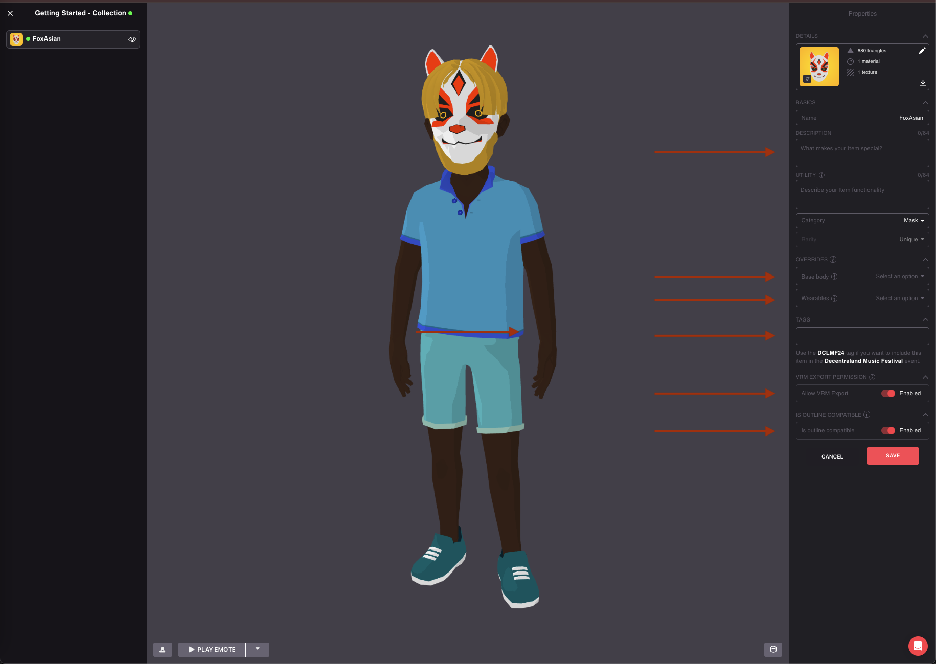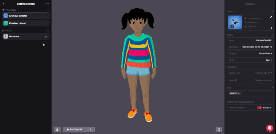 By clicking on the icon at the lower left you will be able to edit the avatar. This is pretty useful if you have a male and female version of your wearable, so make sure to check how both versions look like in editor, testing different emotes to identify if there are any skinning issues and mixing other wearables to see how it matches with different clothes. When you’re done editing your wearable, click on Save.