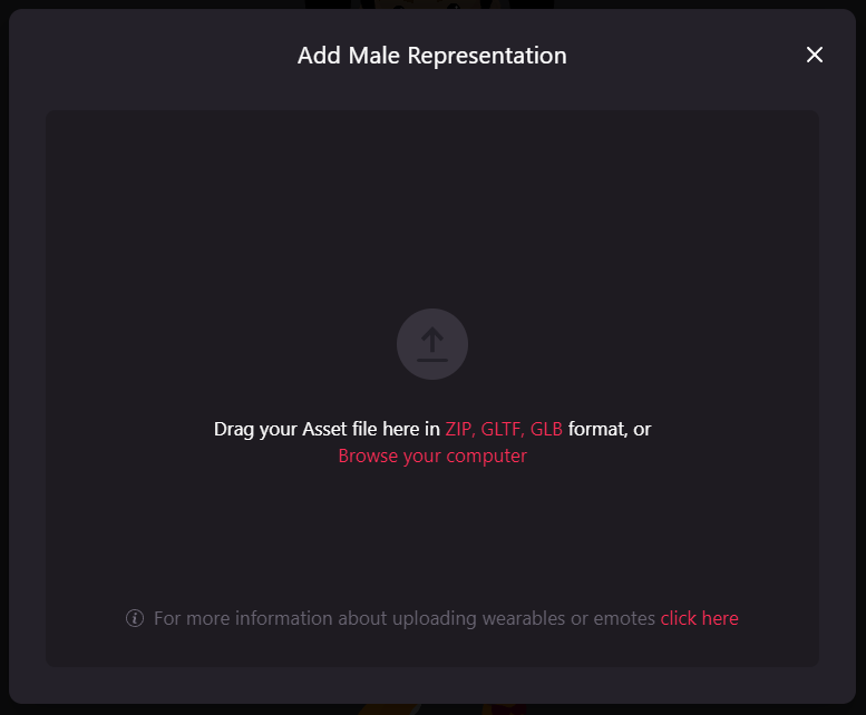 Once you click on it, you will get the Add Male/Female representation window, drag and drop the other representation file to upload it. Once uploaded, another window will show up the wearable and if everything is ok, just click on Save.