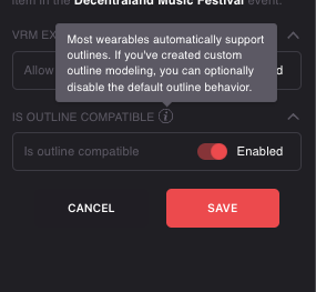 The Outline toggle controls whether your wearable is compatible with Decentraland’s outline rendering system (used in Medium/High quality settings). By default, this is enabled for all new wearables.
